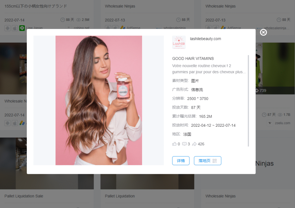当我们通过条件搜索到对应的广告素材时,GoodSpy会提供详细的素材曝光数据。包括投放地区,广告形式以及累计曝光估算等。比如下面这个例子,这款商品在世界上最大的图片平台Pinterest上以图片素材类型进行投放的广告投放了87天,累计曝光估算超过1亿: