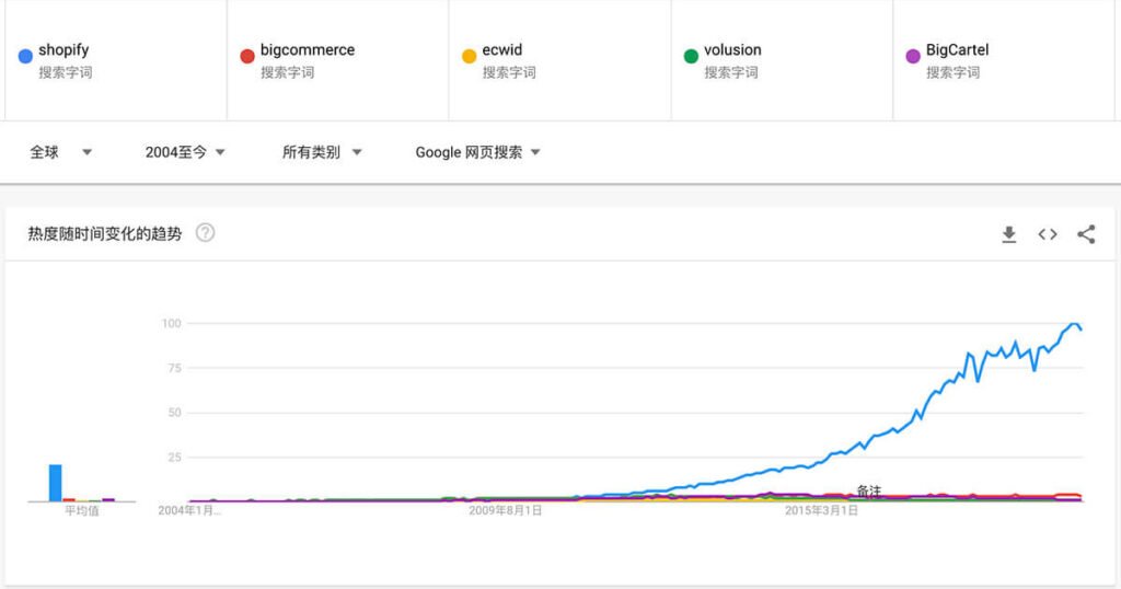 要说明一点的是,Google Trends代表的只是话题的热度,可能大家在讨论的是Shopify的财报和股票,而不是要不要在Shopify上建站卖货呢?不过瘦死的骆驼比马大,Shopify在这几个公司里面当老大应该没有人反对吧?