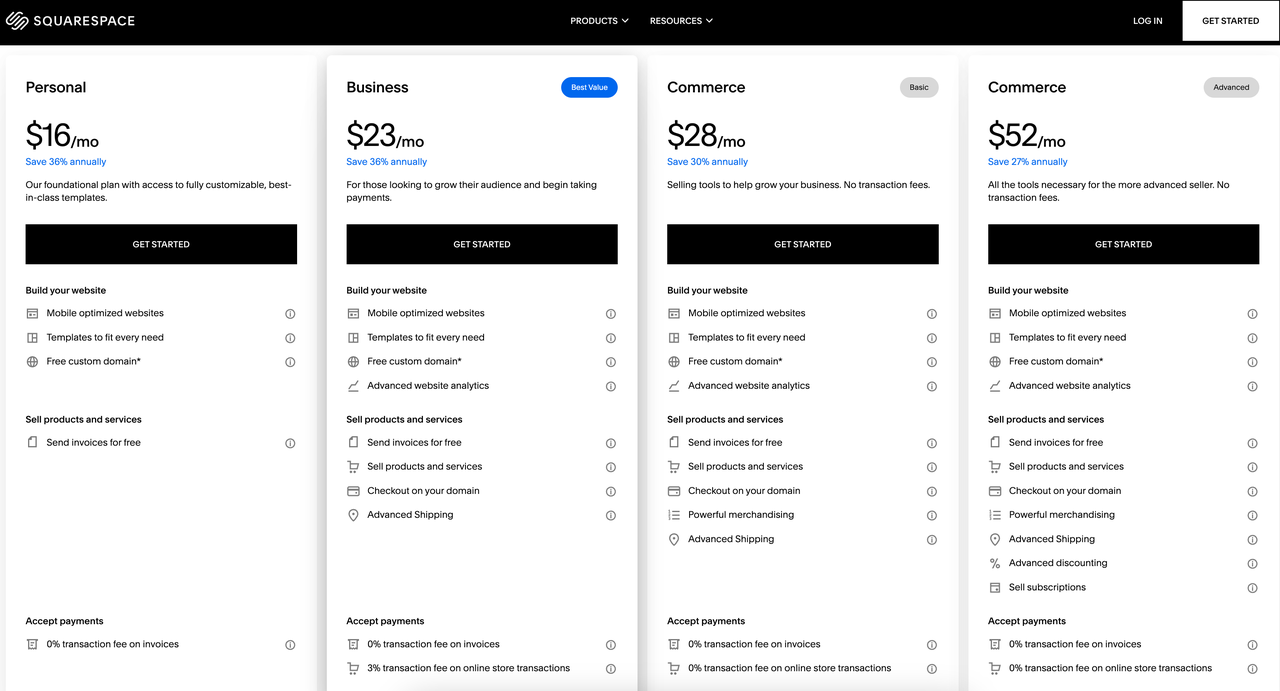 ⭕️ Squarespace:Squarespace 有四个套餐版本,且入门门槛更低: