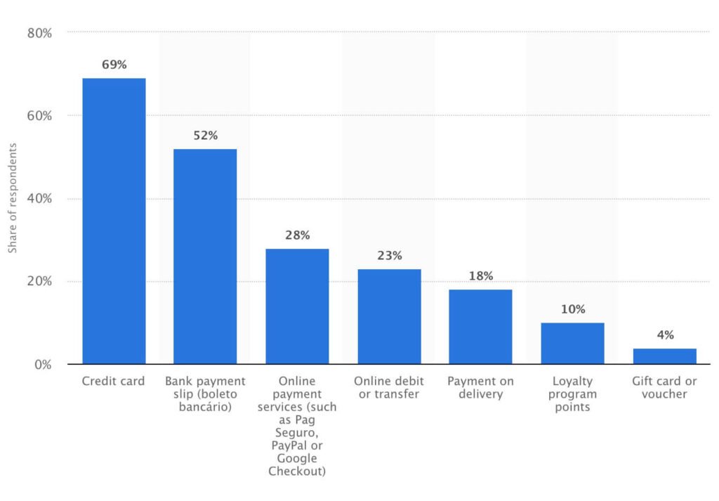 如果我们做的是某一个特定的市场,我们就要首先通过各种渠道了解目标市场用户常用的支付方式,然后对应的选择我们需要给网站添加的支付渠道。例如我们只做巴西市场,仅仅开通PayPal肯定是不行的,因为根据第三方调查公司的预测,2023年巴西47%的用户使用信用卡支付,只有约16%的用户会使用电子钱包(Digital wallet),PayPal 只是这16%电子钱包中最受欢迎的一种。